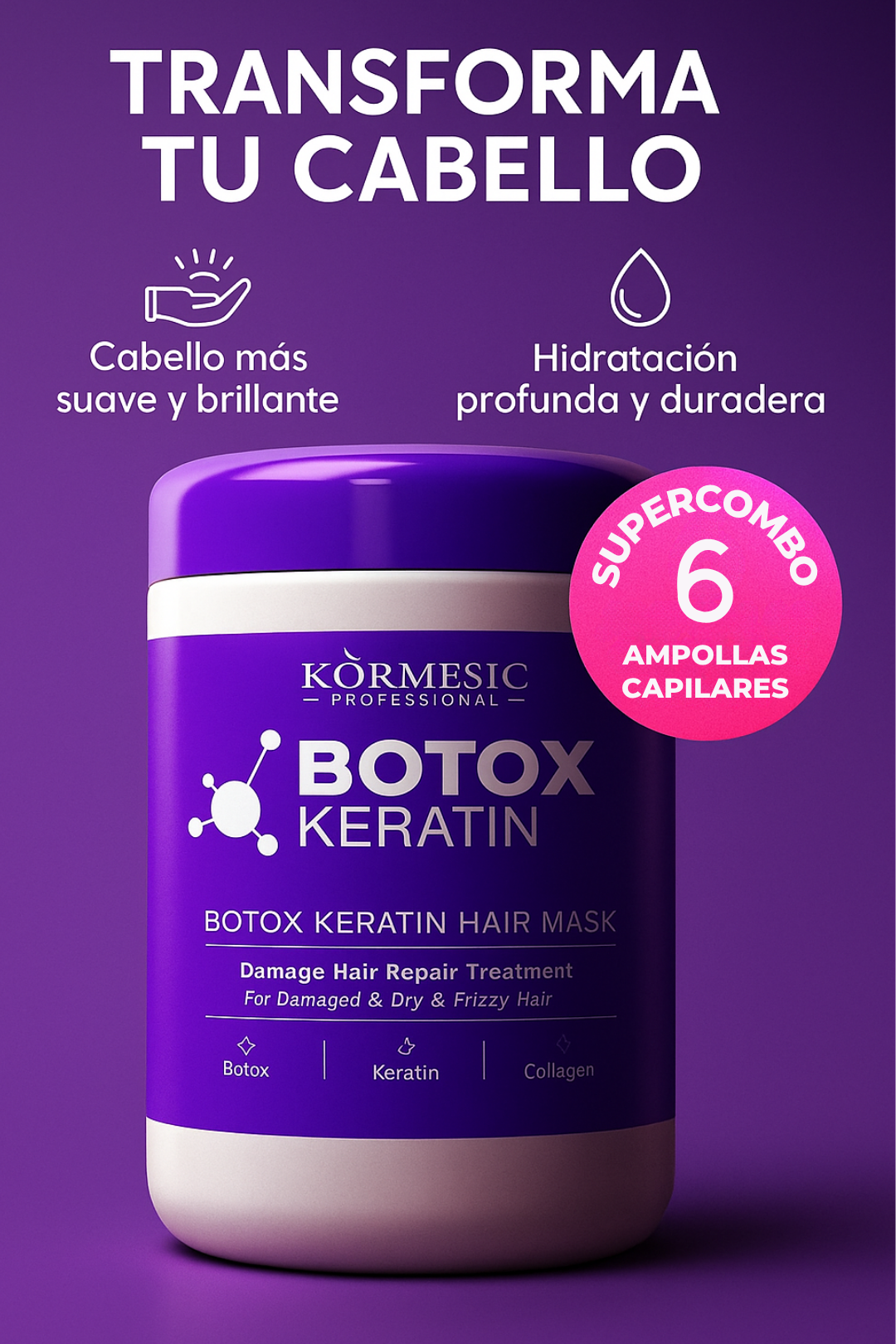 El Supercombo Kórmesic combina la potencia de la Botox Keratin con 6 Ampollas de Botox Capilar, para una reparación profunda, brillo intenso y alisado natural duradero.